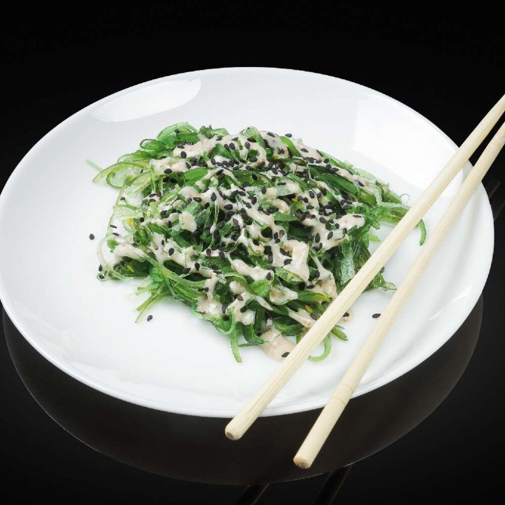 Салат чука политый ореховым соусом и посыпанный кунжутом