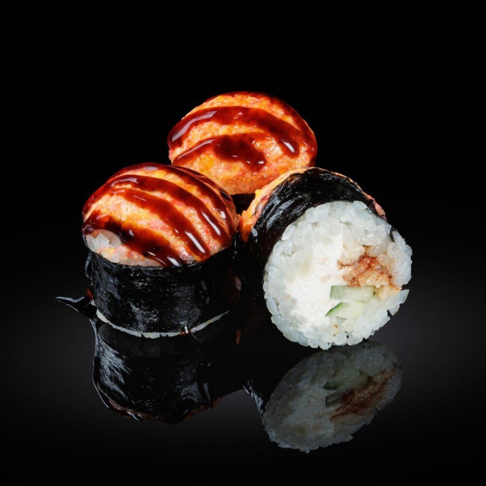 Этот ролл — настоящее наслаждение! Нежный угорь и кремовый твороженный сыр гармонично сочетаются с хрустящим огурцом и морскими нотками нори. Яркая красная шапка из сыра гауда, моцареллы, майонеза, масаго и кимчи добавляет остроты и пикантности.Завершает композицию сладковатый унаги соус, создавая гармоничное и запоминающееся сочетание!